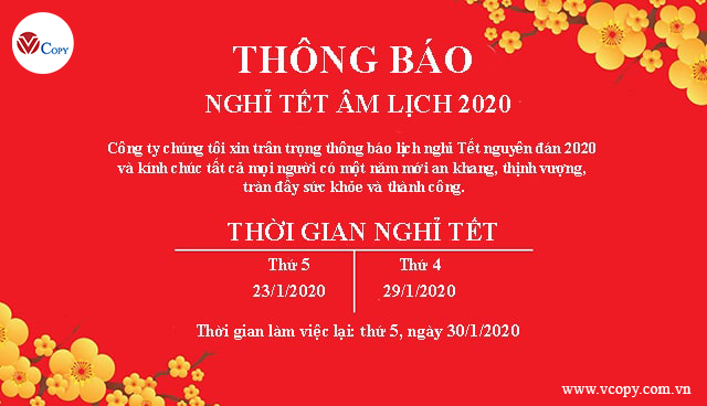 Lịch nghỉ Tết Nguyên đán 2020 của Công ty Máy Văn phòng Việt – VCopy bắt đầu từ ngày 23/01 đến hết ngày 29/01/2020 (tức từ ngày 29 tháng Chạp đến hết mùng 5 Tết Canh Tý)